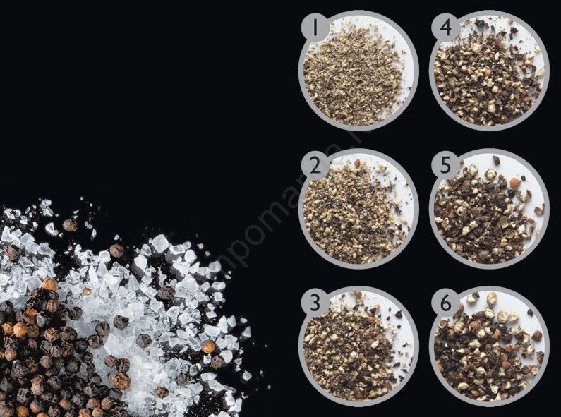 • Za postizanje finog do grubog mlevenja jednostavno zavrnite prsten na jednu od šest (biber) ili tri (so) unapred podešene gruboće.