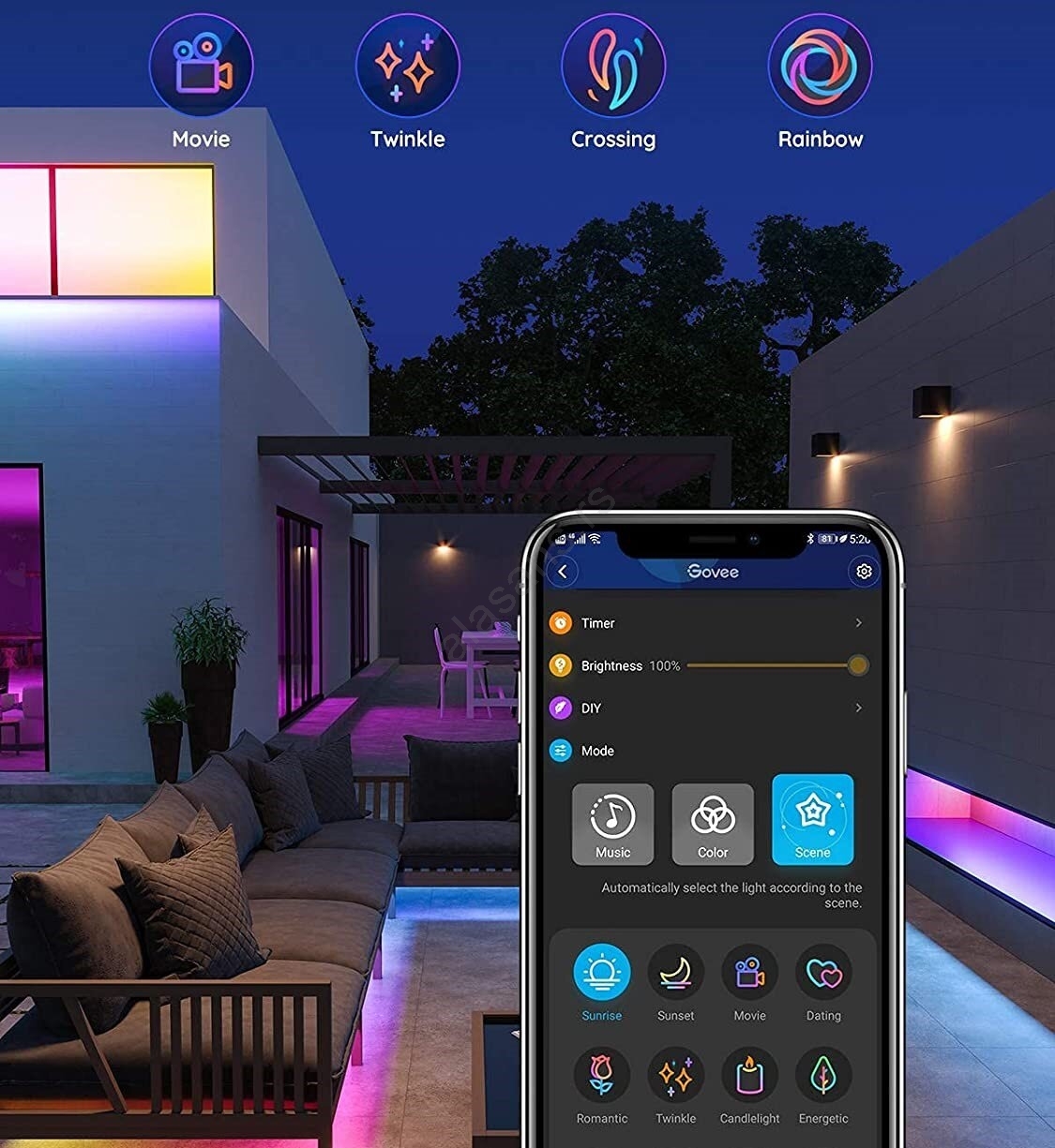 • Dobićete pristup funkcijama tajmera, DIY paletama boja, video režimu, sinhronizaciji muzike i scenskim režimima.
