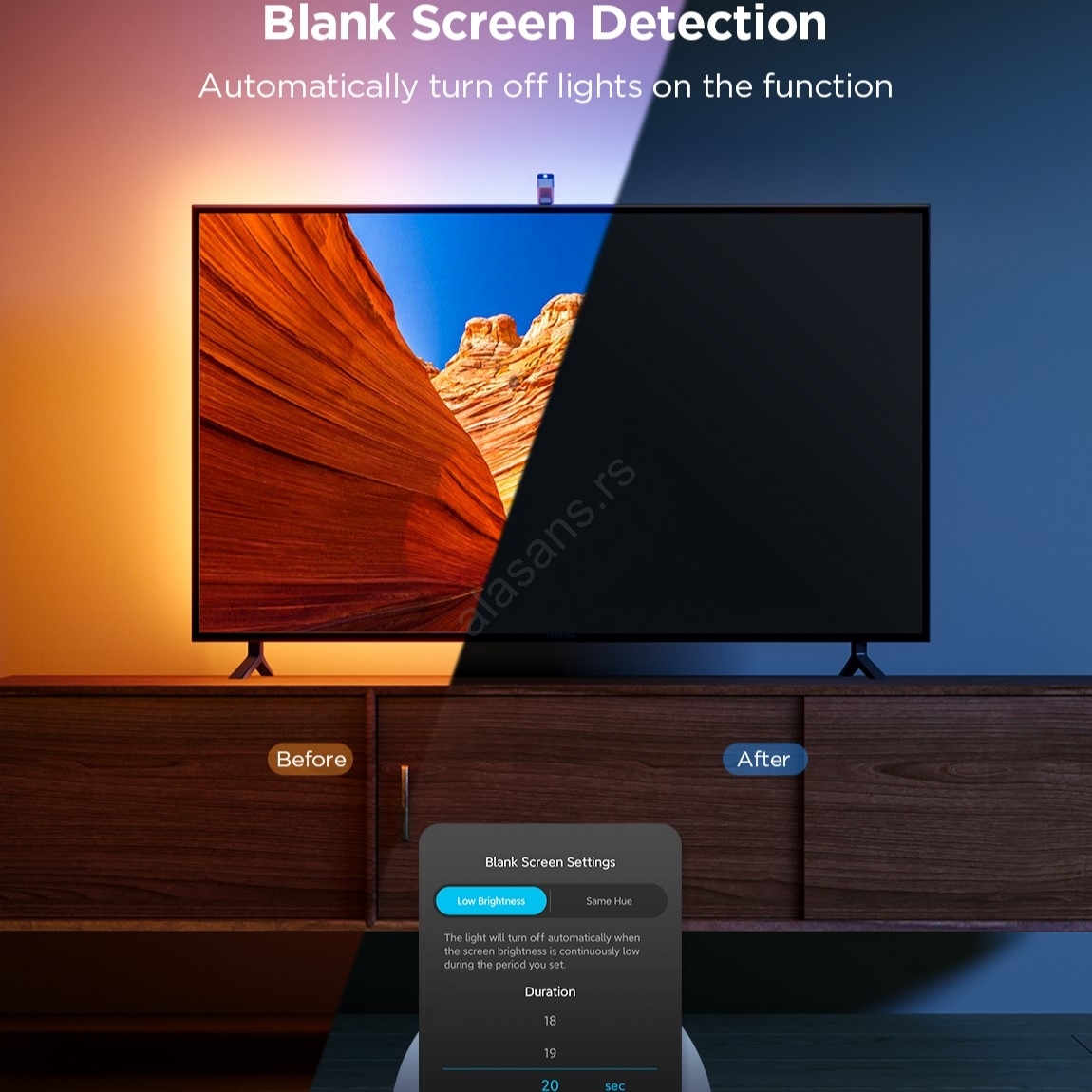 • LED trake su opremljene detekcijom ugašenog ekrana i automatski isključuju svetla kada završite sa gledanjem.