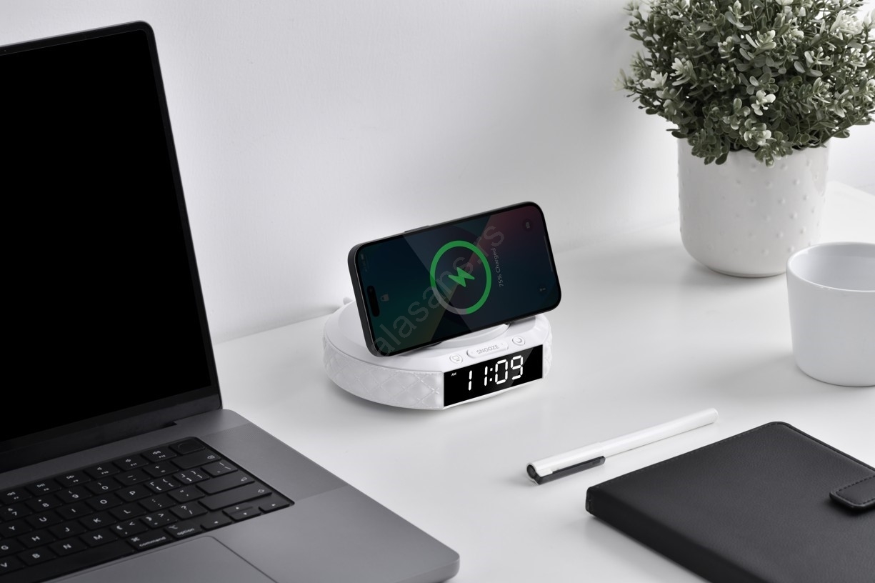 • Elegantni stolni sat i odlagalište sa integrisanim punjačem za vaše pametne uređaje.