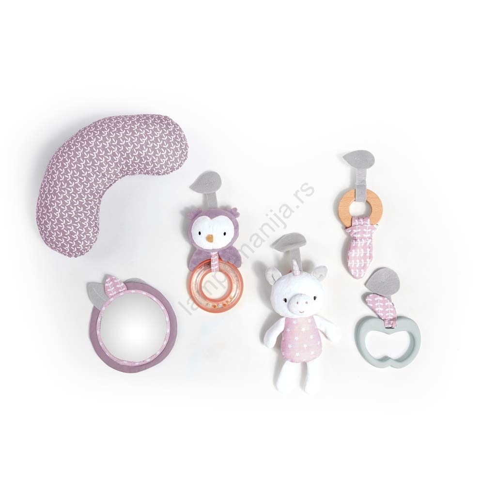 • Sadrži 6 uklonjivih igračaka: plišanog jednoroga, zvečkice sa sovom i perlicama, jabuke od prirodne gume, drvenog prstena, sigurnog ogledalca i jastučića za igru na stomaku.