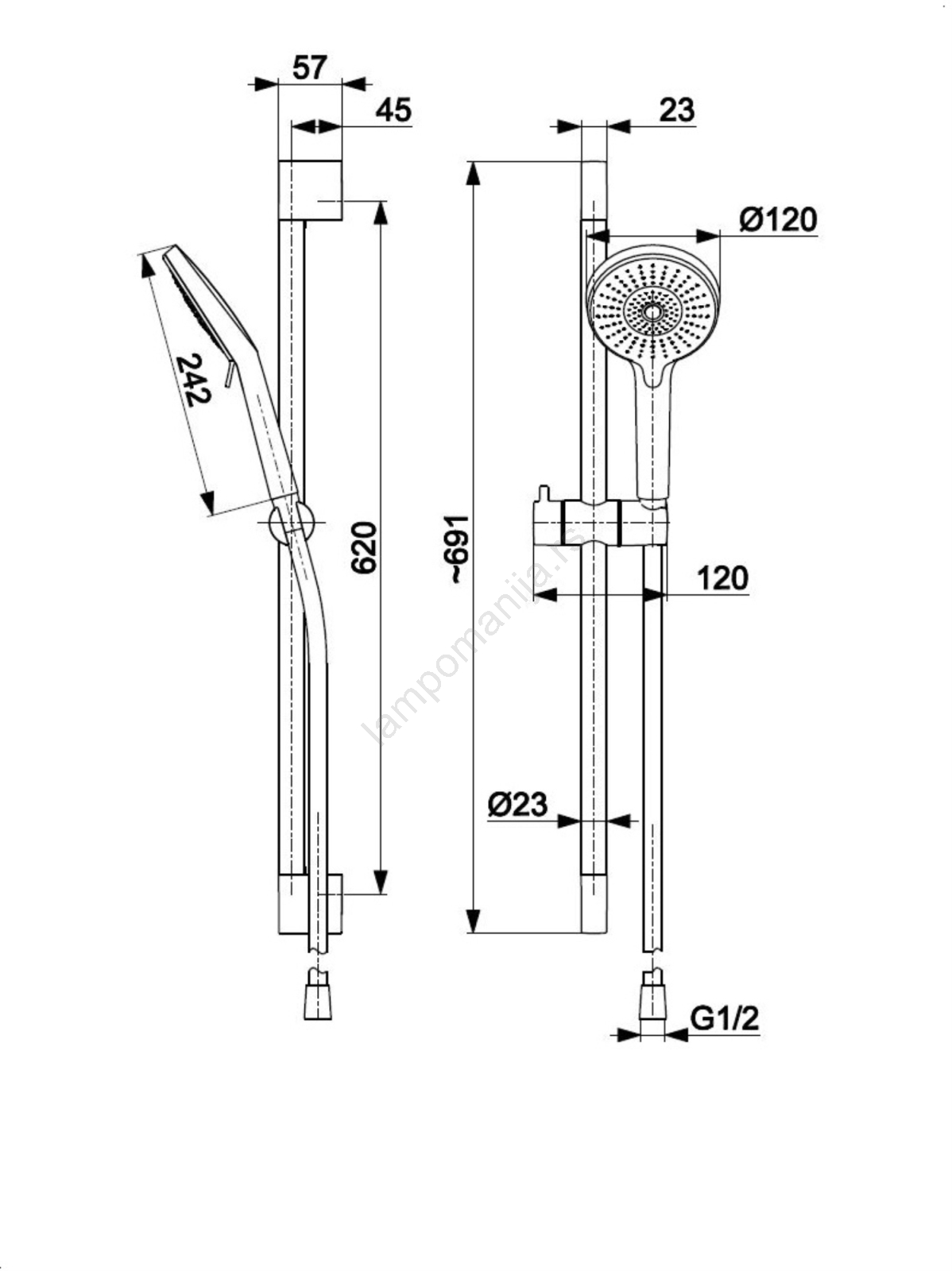 • Pakovanje sadrži: tuš šipka, zidni držači - 2 kom (uključujući 1 držač koji se može prilagoditi položaju postojećih otvora), montažni set (2 vijka sa tiplovima), ručna tuš slušalica sa drškom, PVC crevo (L=1500 mm).
