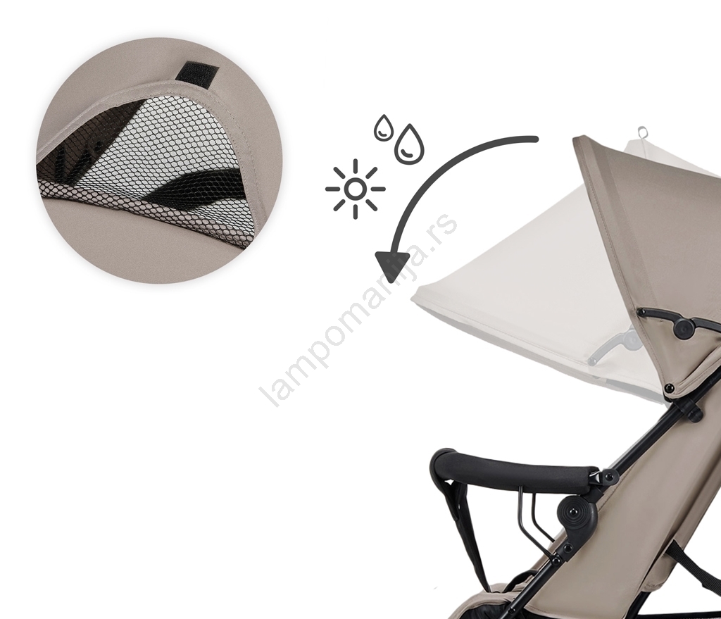 • Rastegljiva krošnja pruža senku i zaštitu, a opremljena je prozorčićem za lak kontakt sa detetom.