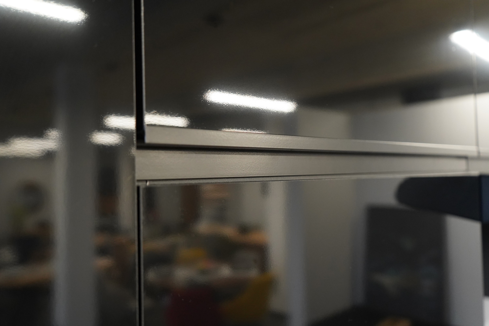 • Prednje površine gornjih ormarića su u sjajnom izdanju, dok donji ormarići imaju mat završnu obradu.