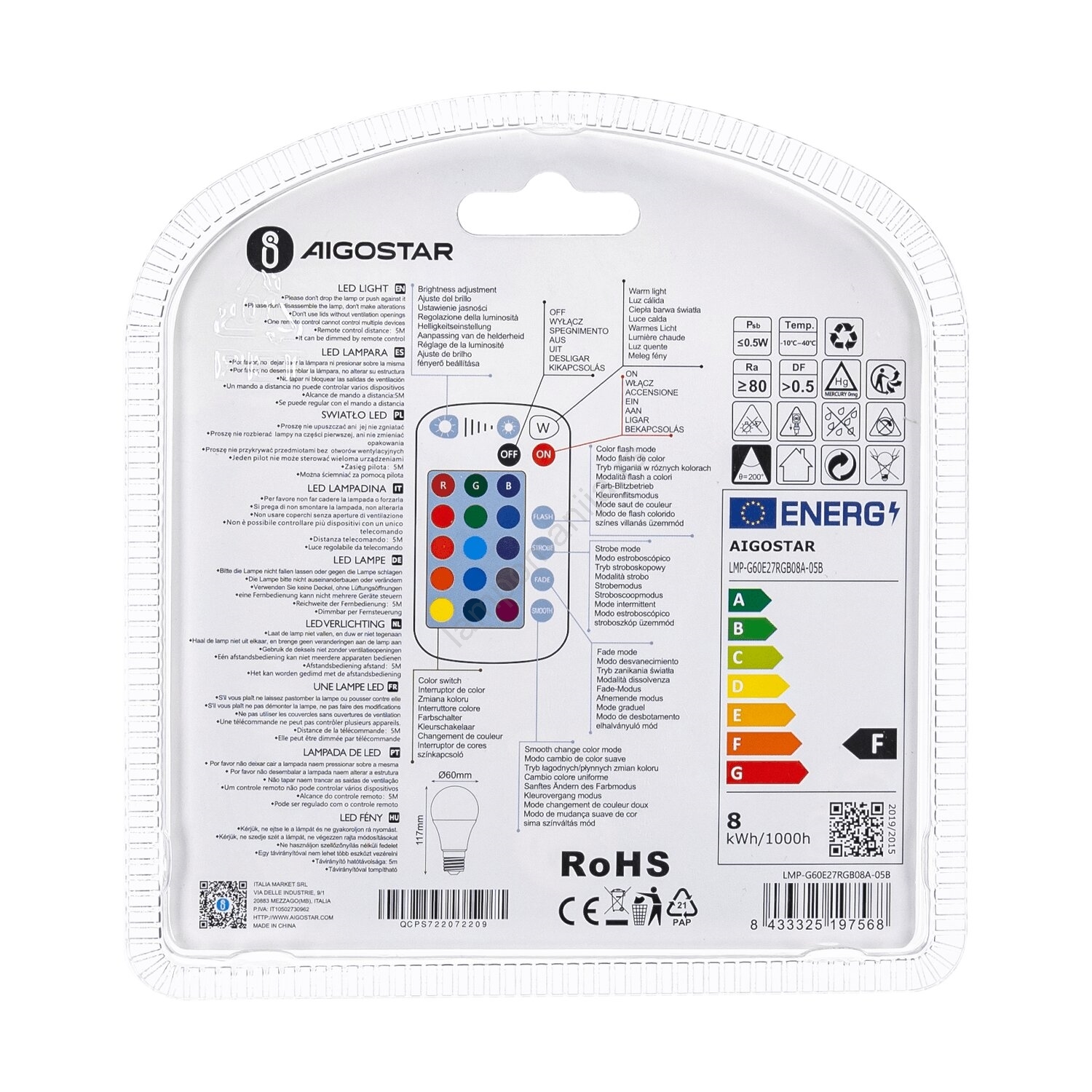 LED RGBW prigušiva sijalica E27/8W/230V 3000K + daljinski upravljač - Aigostar