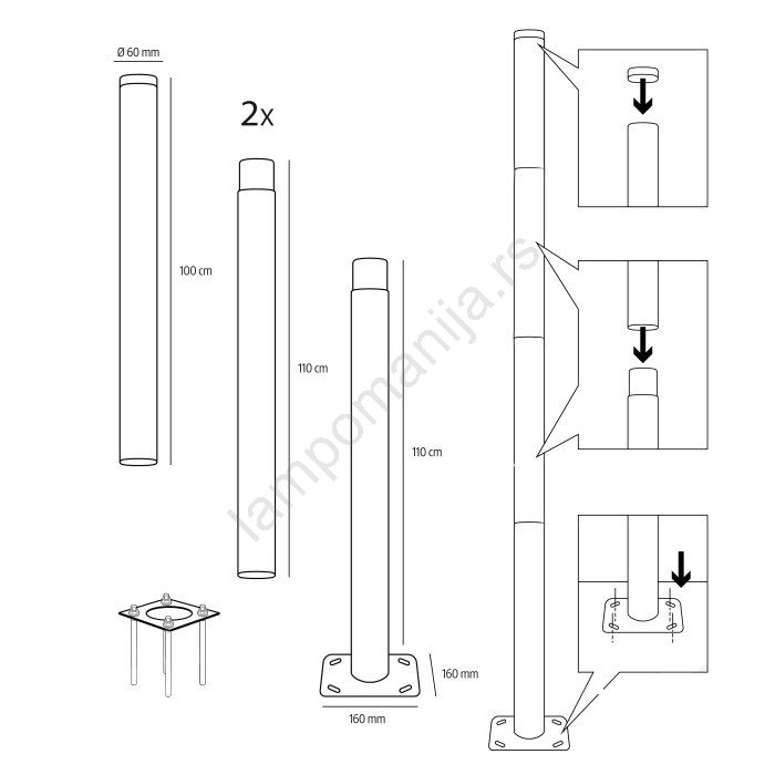 Metalna šipka za stub spoljne rasvete BASE 4 m, prečnika 60 mm, crna