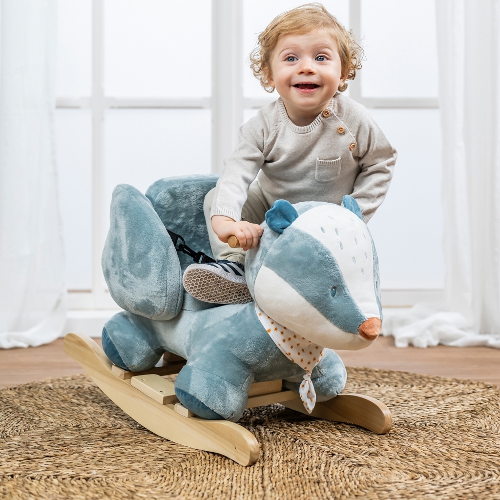• Plišana ljuljaška sa drvenom bazom i ručkama je igračka koja poziva na ljuljanje i maženje.