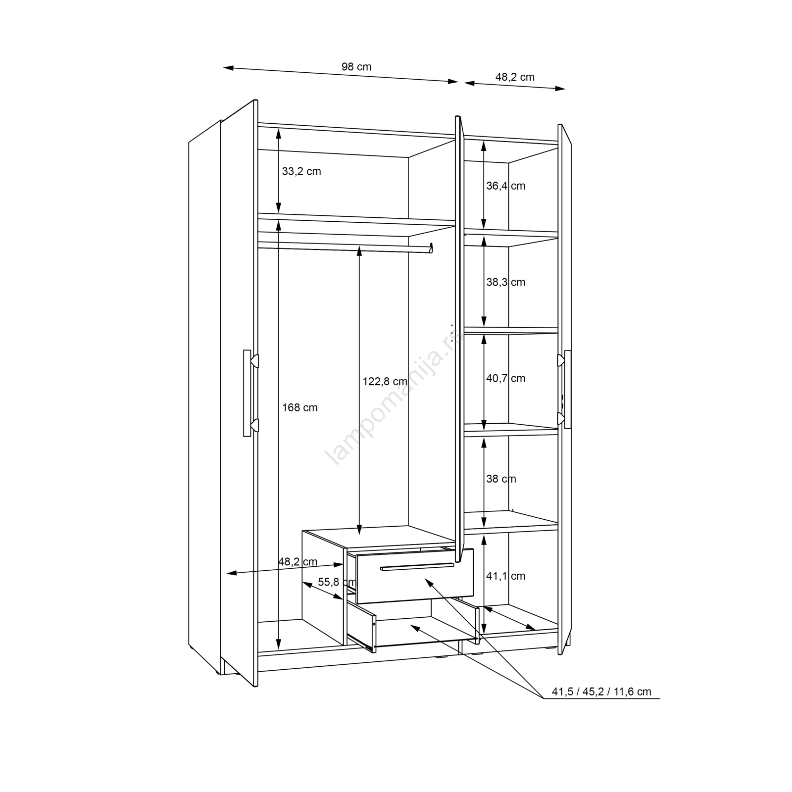 • Ormar ima garderobnu šipku, fioke, police i veliki prostor za odlaganje vaše odeće, torbi i sezonskih stvari.