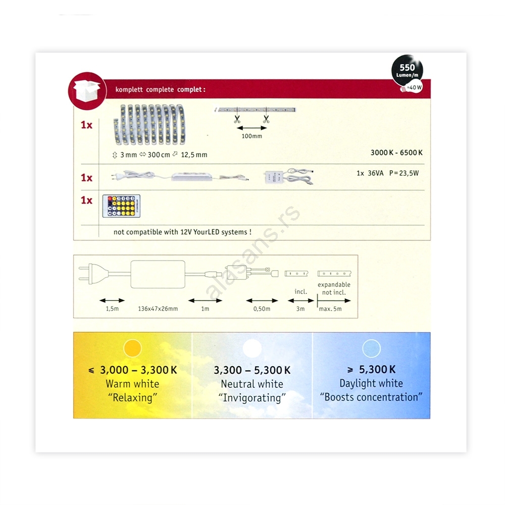 • Set sadrži: LED traku, LED drajver, kontrolnu jedinicu i IR daljinski upravljač.