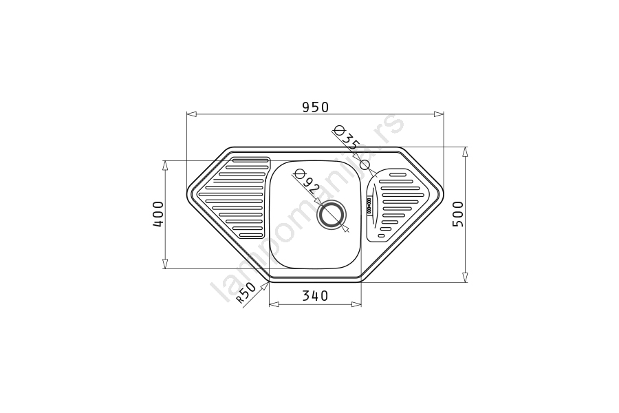 • Ugaoni sudoper od nerđajućeg čelika sa jednim otvorom za slavinu i dve odkapne površine.