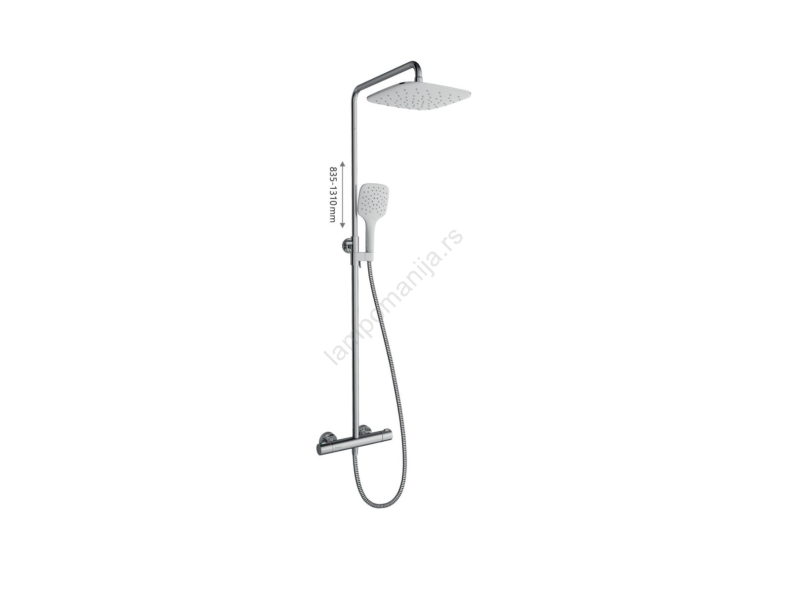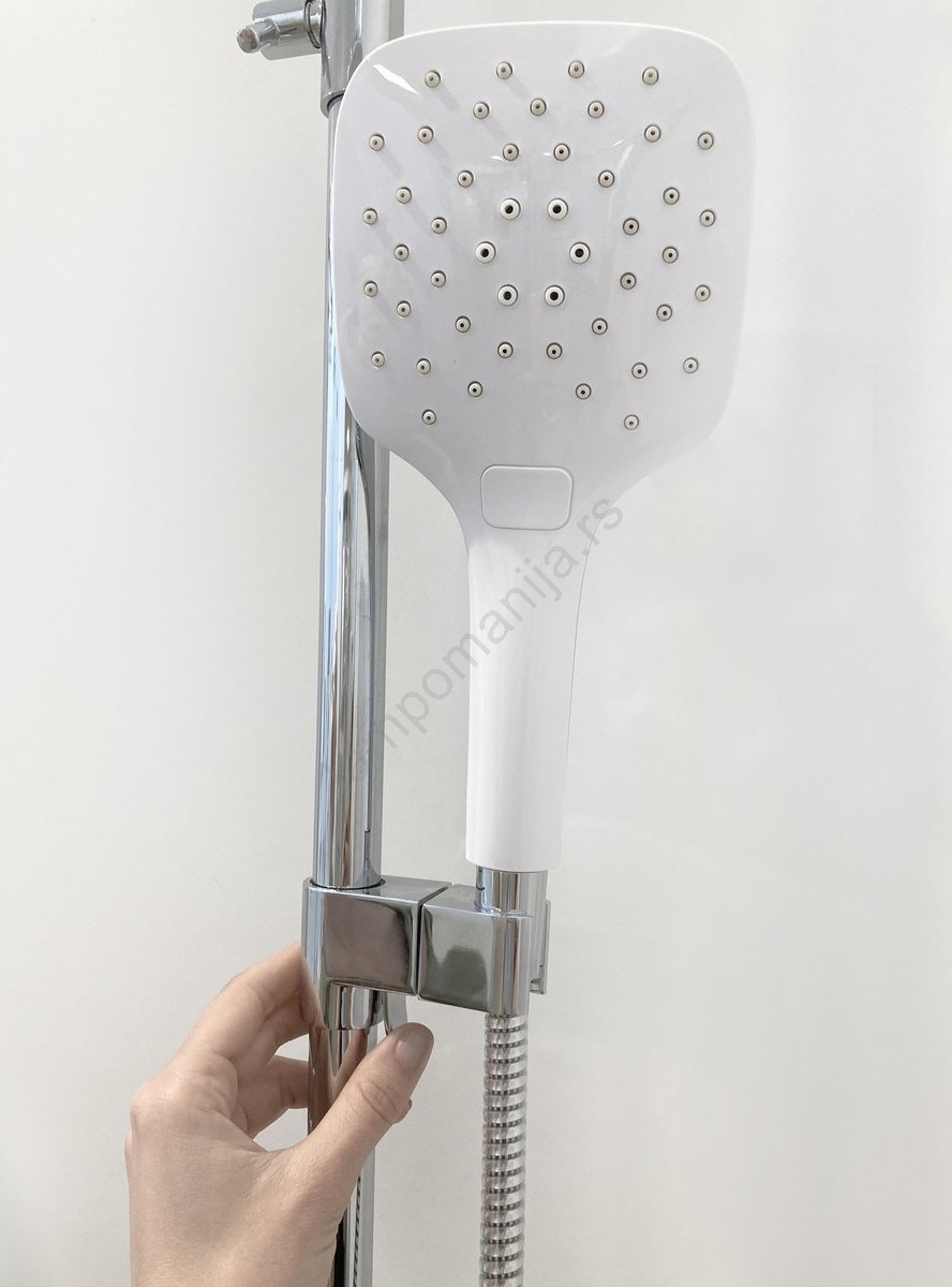 • Tuš kolona Termo je pomični set sa termostatskom baterijom u sjajnom hrom završetku i belom gornjom tuš glavom.