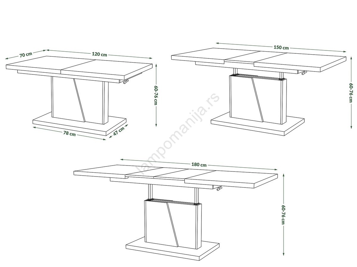• Uz dva nastavka od po 30 cm, ploču stola možete produžiti na 150 ili 180 cm.