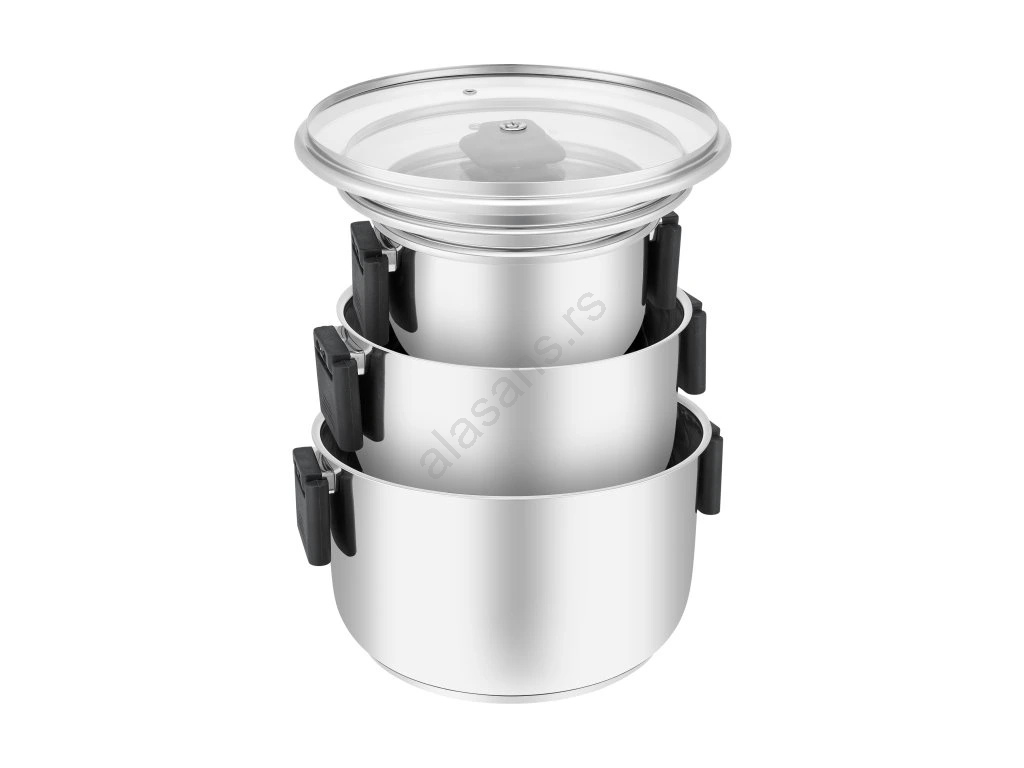 • Set od 3 lonaca Anser sa poklopcem nudi elegantan dizajn i visoku funkcionalnost za svakodnevno kuvanje.