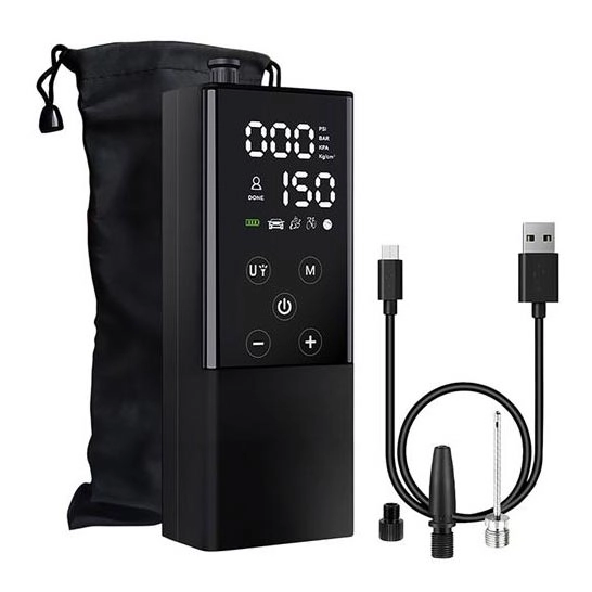 • U paketu: savijeno crevo (uključuje auto ventil), nastavak za Presta ventil, adapter za napajanje, igla za loptu, mlaznica za gumene proizvode, USB-C kabl, vodootporna torbica za odlaganje.