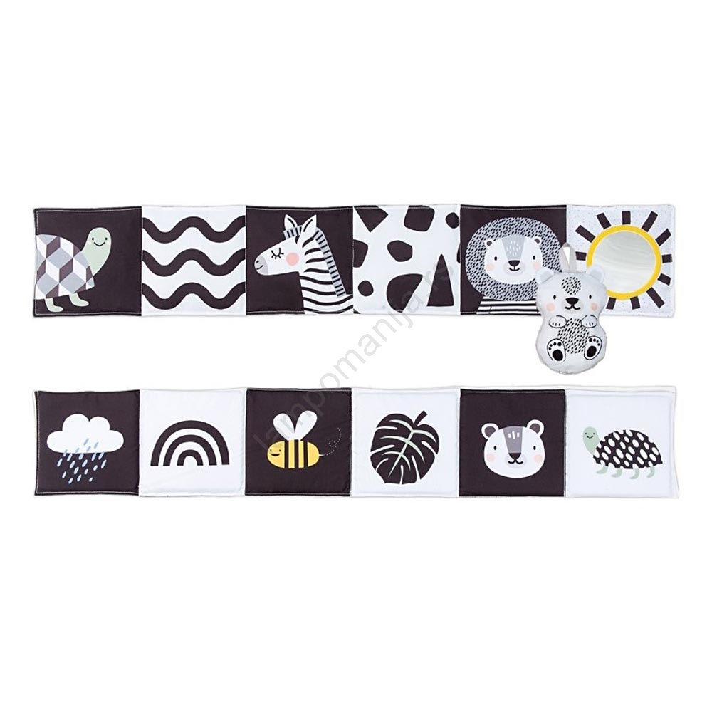 • Dvostrana tekstilna knjiga za najmlađe namenjena je za kolica, krevetac i podlogu za igru.