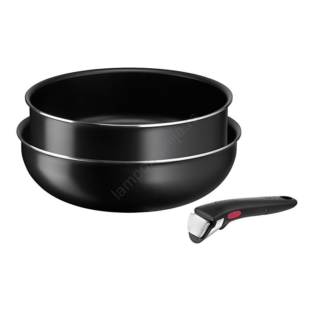 • Komplet od 3 dela sadrži: 1x tiganj za wok (26 cm), 1x duboki tiganj (24 cm), odvojiva drška sa trotačkovnim sigurnosnim sistemom koja može izdržati do 10 kg.