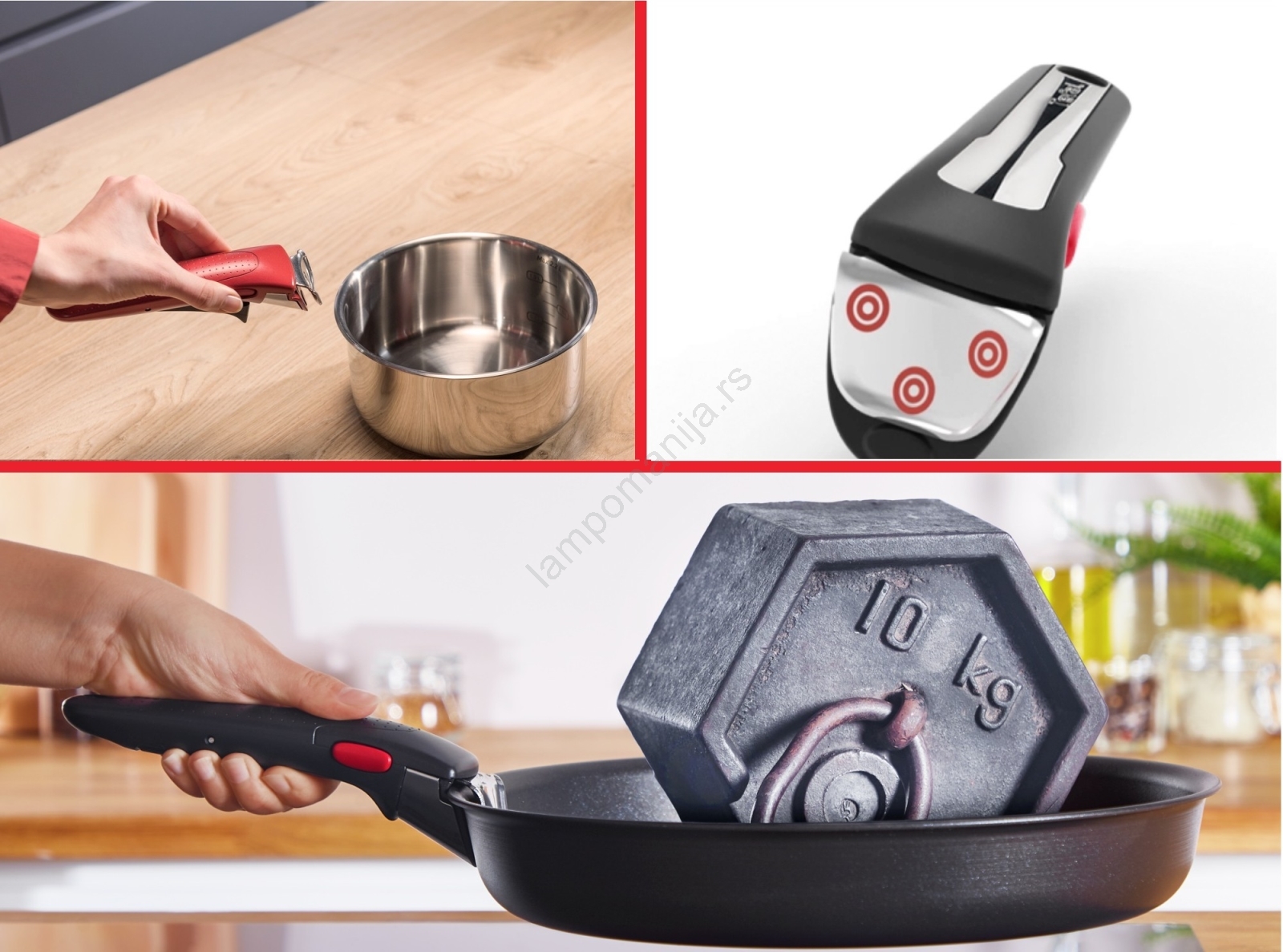 • Set Tefal Ingenio Delight sadrži dva tiganja (Ø 24 cm i Ø 28 cm), dve šerpe (Ø 18 cm i Ø 20 cm), wok tiganj (Ø 26 cm), odvojivu ručku, osam zaštitnih podmetača i 3 komada kuhinjskog pribora (kašika, lopatica, duga lopatica).