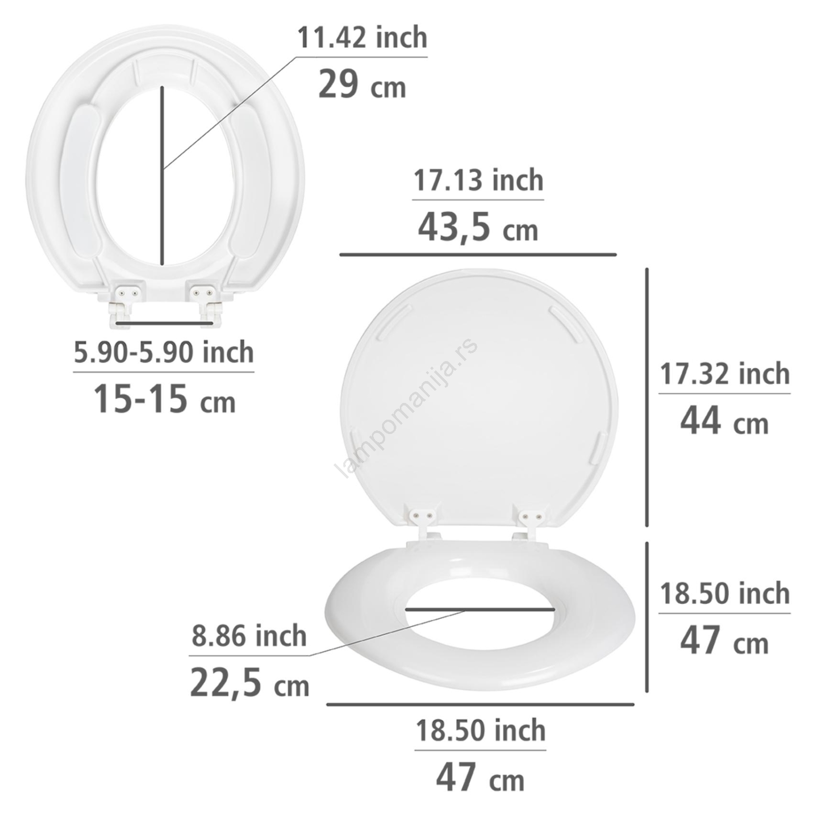 • Značajno veće od standardnih WC sedala – idealno za dodatni prostor i udobnost.