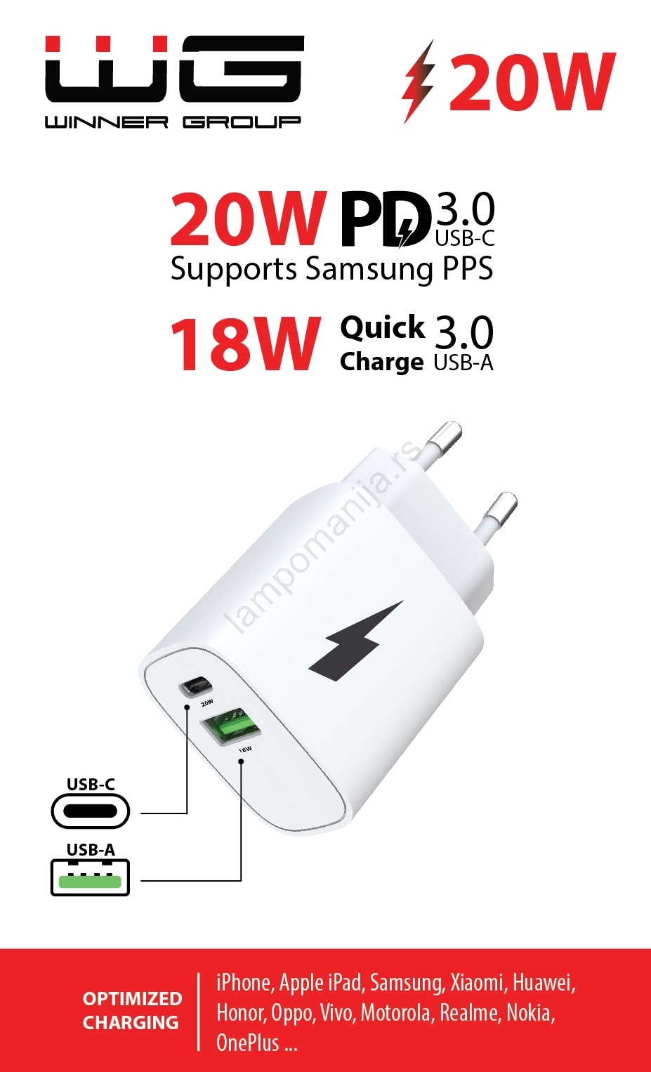 • Mrežni punjač sa dva USB porta, podrškom za Power Delivery (PD) 20W i Quick Charge (QC) 3.0 sa izlazom 18W pruža efikasno i brzo punjenje za vaše uređaje.