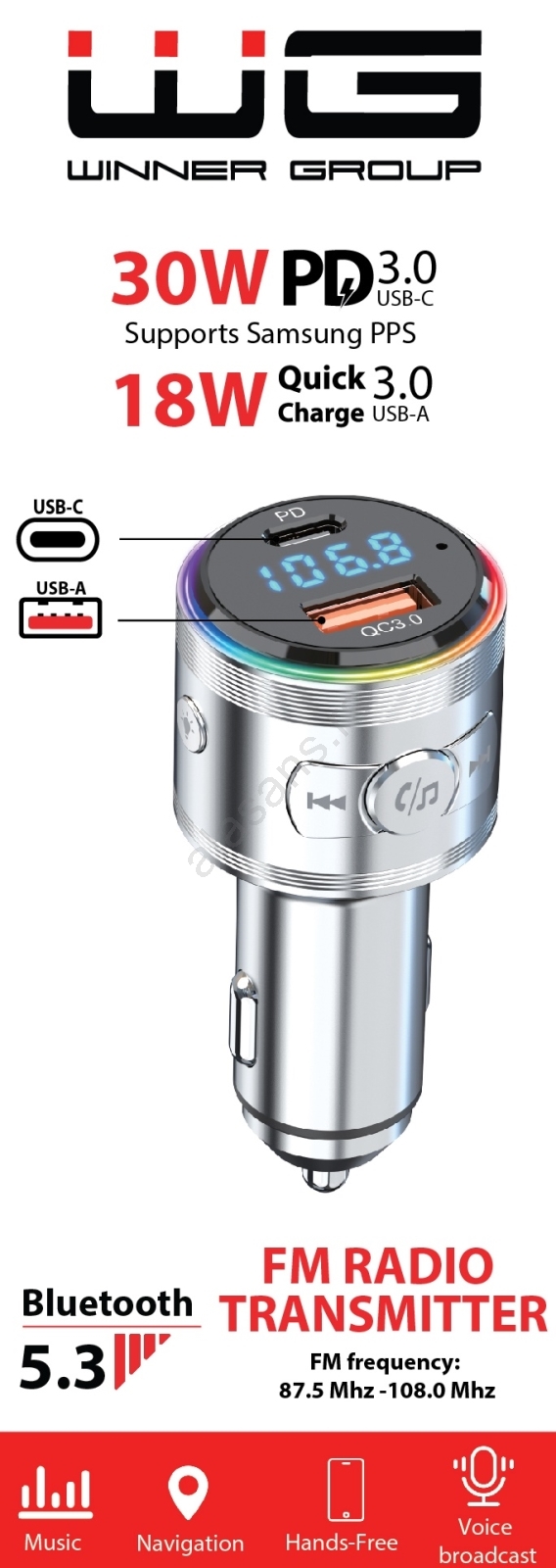 • Auto punjač sa PD 3.0 USB-C 30W, QC 3.0 USB-A 18W, Bluetooth 5.3 i FM predajnikom u srebrnoj boji je moderan multifunkcionalni uređaj za punjenje i zabavu na putu.