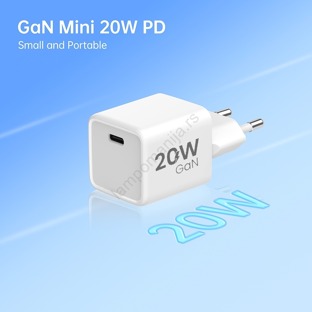 • Ovaj kompaktni i snažan GaN mrežni punjač ima jedan USB-C port i podržava Power Delivery tehnologiju sa snagom do 20W.