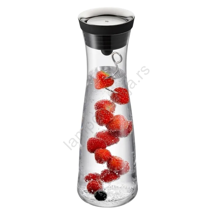 • Ima integrisanu mrežicu koja pouzdano zadržava kocke leda ili komade voća/bilja unutar karafe.